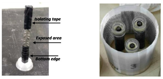 A three-electrode electrochemical cell was used for monitoring the corrosion response of the steel rebars, as shown in Figure 1 (right). For the electrochemical measurements, a stainless-steel mesh located around the samples was used as a counter-electrode, an Ag/AgCl electrode in 3 M KCl was used as a reference electrode, and the reinforced samples acted as working electrodes.