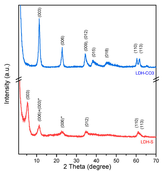 XRD patterns of LDH-CO3 and LDH-S. * Peaks of the carbonate phase in LDH-S.