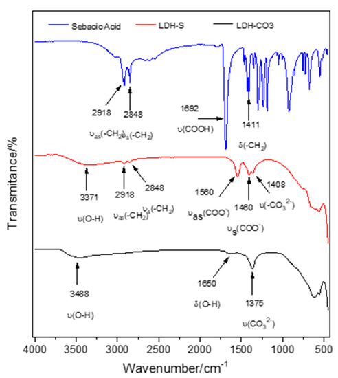 The FT-IR spectra of LDH-CO3 (Figure 3) shows a characteristic band at around 3500 cm−1, corresponding to the water molecules and free OH− groups stretching vibrations, the band at 1650 cm−1 corresponding to the bending mode vibration of water molecules, and the band at 1375 cm−1 of the carbonate antisymmetrical stretching mode. LDH-S spectra showed the most characteristic bands of fatty acid at around 1560 cm−1 and 1460 cm−1 due to antisymmetrical and symmetrical vibrations of carboxylate groups, respectively, as well as the C-H stretching vibrations at ~2900 cm−1 and bending vibrations at ~1408 cm−1 of the aliphatic chains. The absence of the protonated carboxylic group (-COOH) band of sebacic acid at ~1700 cm−1 confirmed that this compound is intercalated in the interlayer in its anionic form.