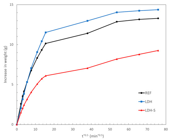 In Figure 4, the weight gain as function of the square root of time for the three tested mortars is represented (the average value of two samples per mortar is shown). Typical behavior can be observed in two different stages: during the first hours, a linear weight increase with the time is registered, until the second stage is reached, in which the weight gain is almost stabilized.