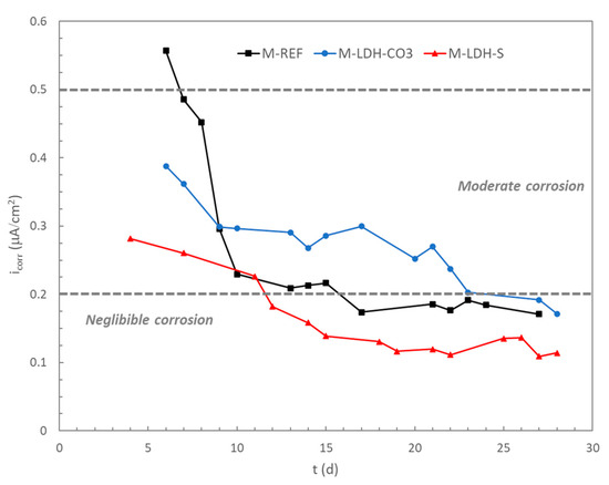 Concerning the evolution of the corrosion current density (icorr), the typical response of a passivation process was also observed for the three studied mortars, as shown in Figure 6. In this case, lower values of icorr during the whole period of curing were registered for the rebars embedded in mortar containing LDH-S. The inhibitive action of the sebacate incorporated in the interlayer of the LDH can be confirmed when compared to the evolution of icorr for the rebars in mortars with LDH-CO3. In this latter case, higher corrosion rates were registered, as well as a delay in reaching the corrosion values below 0.2 μA/cm2, which can be considered as the boundary between negligible and active moderate corrosion [36]. The presence of sebacate in the interlayer of the LDH seems to promote the passivation of the rebar, as the passive situation related to a negligible corrosion was reached before the reference case, and lower icorr values were maintained.