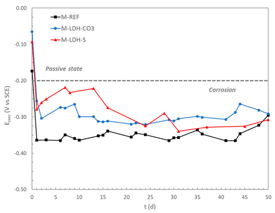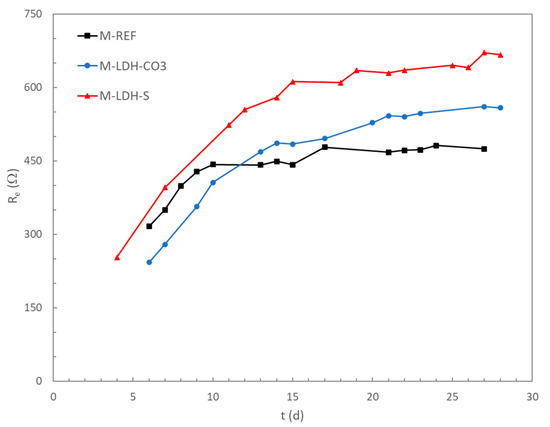 A continuous increase during the first days of curing was observed in all the mortars, as expected due to the evolution of the hydrated solid phases in the cementitious matrix. After some time, an almost constant value of the electrical resistance was reached for the different mortars. This steady stage was reached faster in the case of the reference mortar without any additive than in the other mortars, probably due to the continuous release of water from the LDH that promotes later hydration processes of the cementitious matrix [37]. Higher values of the electrical resistance were measured for the M-LDH-S, as expected due to the water-repellent ability of this additive, as has been confirmed in Section 3.2 in the present study. The higher values of the electrical resistance in the mortar incorporating LDH-S seem to be related to a more protective action of this mortar on the passivation processes of the steel rebars (see Figure 6).