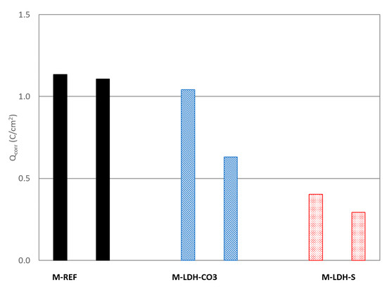 To evaluate the efficiency of the corrosion inhibitors based on LDH, the total charge passed during the entire chloride exposure period (Qcorr) has been estimated and represented in Figure 10 for the different studied mortars. In this case, the response of each rebar has been considered, and therefore two points for each mortar are shown in Figure 10.
