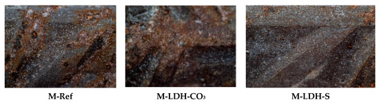 The visual inspection of the rebar surface confirms the electrochemical results. While the reference mortar and the M-LDH-CO3 show corrosion spots distributed on the exposed surface, in the case of the M-LDH-S mortar, the presence of these spots is not evident.