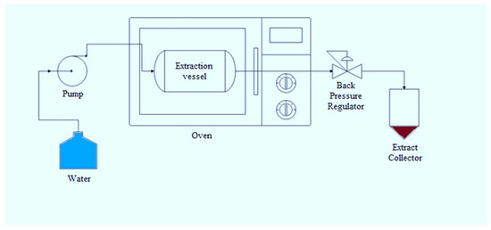 A 50 mL extraction vessel, high-pressure water pump (Supercritical 24, Japan), back pressure regulator (Swagelok, Cleveland, OH, USA), and oven constitute the SWE system (Memmert, Germany). The schematic diagram of SWE is shown in Figure 1. The extraction process was performed at temperatures of 120 °C and 180 °C with flow rates of 2 and 6 mL/min and a pressure of 15 MPa. The extraction time throughout the experiment was 10 min. A total of 5 ± 0.005 g of minced garlic was placed in a 10 mL extraction vessel, followed by deionised water to fill up the empty space in the vessel. Then, the deionised water was continuously pumped using a metering pump (Eldex Optos, Napa, CA, USA). The extraction yield was collected in a vial and stored at −20 °C to prevent any possible degradation before drying using a freeze dryer (Alpha 1–2 LDplus, Germany).
