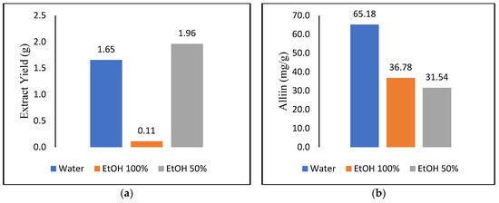 The results of garlic extraction by Soxhlet: (a) yield and (b) alliin recovery using distilled water, ethanol–water (1:1), and 100% ethanol.
