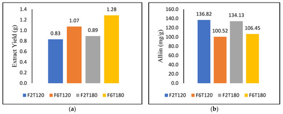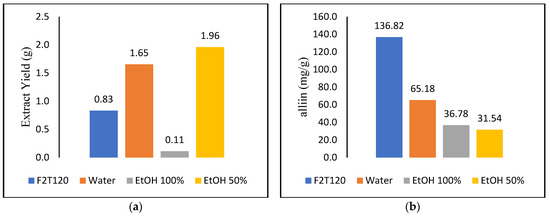 The total extraction yield achieved under optimal SWE conditions was compared to that obtained under Soxhlet extraction conditions. Moderate SWE conditions were chosen (2 mL/min and 120 °C) with a high concentration of alliin in order to compare its performance to Soxhlet extraction. As presented in Figure 5a, the highest extraction yield of 1.96 g was obtained with Soxhlet extraction with ethanol–water (1:1) as the solvent, followed by distilled water with a yield of 1.65 g, and SWE was the third best result, which yielded 0.83 g. Lastly, 100% ethanol had the lowest extraction yield with 0.11 g. Compared to other extraction media, Soxhlet extraction utilising ethanol–water (1:1) provided higher extraction yield. This explains why the majority of garlic’s components are bipolar, with some contributing to its antioxidant function, as mentioned by Ahmad, Ahmad, Riaz, Al-tarouti, Aloufi, AlDarwish, Alalaq, Alhanfoush and Khan [19]. On the other hand, the study by Ramirez, et al. [35] successfully determined both the polar and nonpolar bioactive compound contents in garlic.
