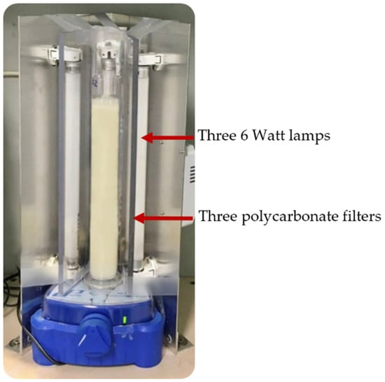 Figure 1 displays the photoreactor for the batch photocatalytic oxidation of the 2,4-DCP. It consisted of a quartz tube reactor placed equidistant (10 mm) from three 6 W GE F6T5 35 lamps. The light from the lamps was filtered by a 3 mm thick polycarbonate UV-cutoff filter to remove wavelengths of <400 nm. The photoreactor setup was placed inside a stainless-steel isolation box to avoid ambient lighting. A pair of DC fan circulated air and maintained a temperature of 25 °C. A 2,4-DCP stock solution (16 mg/L) was diluted to 4.08 mg/L, and 100 mL was added to the reactor, along with 100 mg photocatalyst to create a 1 g/L catalyst loading. The initial pH of the solution was ~6.5 before starting the photocatalytic reaction. The reaction mixture was stirred in the dark for one hour to allow adsorption equilibrium to be reached before turning on the light. Then, at fixed time intervals, 2 mL of the reaction mixture was drawn and centrifuged at 6000 rpm (Labnet C-1200 Mini Centrifuge) for 4 min. The supernatant was analyzed in triplicate by a UPLC (WATERS Acquity H-class) equipped with an ACQUITY UPLC BEH C18 Column (2.1 mm × 100 mm, 1.7 µm). The concentration of 2,4-DCP was recorded by optical spectrum measurement at 284 nm. The mobile phase in the UPLC consisted of acetonitrile and 0.1% trifluoroacetic acid solution at a flow rate of 0.35 mL/min (25 °C). The total organic carbon (TOC) was determined with a Shimadzu TOC-LCPH/CPN. The reaction for each photocatalyst was repeated three times.
