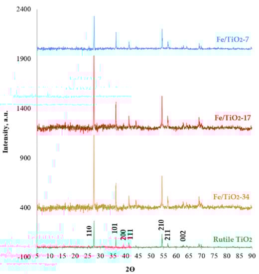 Figure 2 plots the X-ray diffraction of the rutile and ball-milled TiO2 and the prepared Fe/TiO2 samples, which display only diffraction peaks corresponding to the rutile TiO2 [38,39]. Doping the samples with 5 wt.% Fe3+ showed a slight 0.033° shift for the Fe/TiO2-34 and Fe/TiO2-17, and a 0.066° shift for the Fe/TiO2-7. In contrast, the ball-milled TiO2 did not show any diffraction shift from that of the rutile TiO2. This slight shrinkage in the lattice (i.e., 0.00003 and 0.006 Å, respectively) is consistent with the lattice substitution of Fe3+ for Ti4+. Indeed, the Fe3+ ion (0.64 Å) is slightly smaller than the Ti4+’s radii (0.68 Å), and i9t can readily be inserted into the TiO2 lattice [40]. The crystal size was smaller following ball-milling, as indicated by the diffraction peaks broadening, and the ball-milled TiO2 measured 48.3, 45.1, and 41 nm for the Fe/TiO2-34, Fe/TiO2-17, and Fe/TiO2-7, respectively, compared to the rutile TiO2 (73.3 nm).