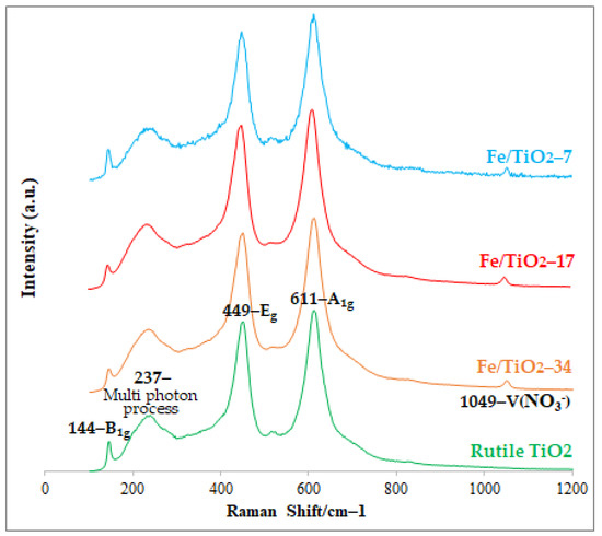 The micro-Raman spectra in Figure 3 are consistent with the XRD data and display only the characteristic bands of the rutile TiO2 at 144 cm−1 (B1g), 449 cm−1 (Eg), and 611 cm−1 (A1g). The 237 and 1049 cm−1 bands originate from multiple phonon-scattering processes and NO3- ions, respectively [41,42]. The absence of iron-related bands indicates the successful doping of iron into the TiO2. In addition, there were no contaminants from the milling bar and jar detected in the samples. The ball-milled Fe/TiO2 had a light-yellow color compared to the rutile and ball-milled TiO2, as shown in Figure 4.