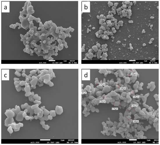 Figure 5 presents the scanning electron micrographs of the rutile TiO2 (Figure 5a), Fe/TiO2-34 (Figure 5b), Fe/TiO2-17 (Figure 5c), and Fe/TiO2-7 (Figure 5d). During ball-milling, the sample underwent collisions and attritions which subjected the particles to repetitive breaking–welding–breaking cycles that gradually abraded large particles into fine grains [43]. The ball-milled Fe/TiO2 samples are less aggregated and better dispersed than the rutile TiO2 (Figure 5a). Further, the Fe/TiO2 powders prepared with balls of different sizes (i.e., 15, 12, 8, and 5 mm) have a broader particle size distribution (cf. Figure 5b,c) compared to the powder ball-milled with balls of similar sizes (i.e., 8 and 5 mm), as shown in Figure 5d. The Fe/TiO2 milled at a higher B/P with less sample led to air-grinding and rounder particles.