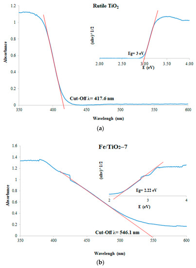 The UV-Vis diffuse reflectance spectra (DRS) and corresponding Tauc plots of the rutile TiO2 and Fe/TiO2-7 are presented in Figure 7. The TiO2 has an absorption edge at the 368 nm wavelength (Figure 7a) and calculated bandgap energy (Eg) of 3.00 eV (at the 417 nm cut-off Landa), which is consistent with the literature [46,47]. Ball-milled Fe/TiO2 shifts the absorption edge of the visible region (546 nm) and narrows the bandgap to 2.22 eV. It is believed the iron creates new e-/h+ and traps energy levels (Fe4+/Fe3+ and Fe3+/Fe2+) between the conduction band and valence band of TiO2 precursors [48,49]. Lattice defects from ball-milling can also play a role [50]. The earlier work by Carneiro et al. [50] prepared Fe/TiO2 by ball-milling aeroxide TiO2 P25 with 10 wt.% Fe to obtain photocatalysts that were 2.45 eV broader, in comparison with this study.