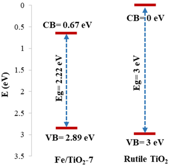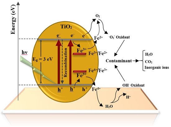 The Fe2+ and Fe4+, being less stable than Fe3+ and their relative energy levels Fe3+/Fe4+ and Fe3+/Fe2+ (Figure 11), allow the trapping of photo-generated e-/h+ and increase their lifetimes [64]. Prior work [65] has indicated that the energy level of the Fe3+/Fe2+ is below the TiO2 conduction band, while that of Fe4+/Fe3+ is above the TiO2 valence band [66]. Therefore, the transition of e- from Fe 3d orbitals to CB of TiO2 induces local states below the conduction band edge. This can significantly decrease the bandgap and increase the removal efficiency [59,66].