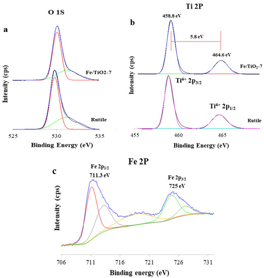 The XPS analysis of the rutile TiO2 and Fe/TiO2-7 is shown in Figure 9. The O 1s peak at 530.1 eV (Figure 9a) belongs to the lattice oxygen [56], and the peak at 532.8 eV is from chemisorbed (O) [56]. The Ti 2p spectra in Figure 9b show two main peaks of Ti2p3/2 and Ti2p1/2 at 458.8 and 464.6 eV, respectively, with a signal separation of 5.8 eV, which corresponds to Ti4+ [57,58]. Compared to the rutile TiO2, the Ti 2p3/2 and Ti 2p1/2 peaks shifted upward by 0.3 eV, which is attributed to lattice distortions following Fe3+ doping and the milling process. Figure 9c displays two peaks at 725 and 711.3 eV, assigned to Fe 2p1/2 and Fe 2p3/2, respectively. A satellite peak at 719.2 eV indicates the presence of Fe3+ [59]. All these peaks provide conclusive evidence for the presence of Fe3+ ions in the samples [56,60]. None of the binding energies of the Fe2+ (709 and 723 eV) and zero-valent iron (707 and 720 eV) were observed [61,62], which indicates the successful insertion of iron into the TiO2 lattice.