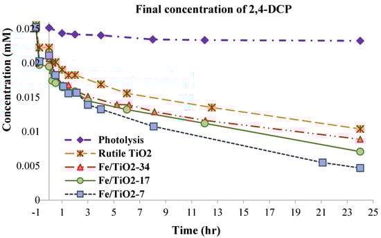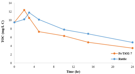 Figure 13 plots the TOC with the reaction time for the rutile TiO2 and Fe/TiO2-7, showing that the latter has a greater mineralization of 2,4-DCP pollutants (i.e., 63.5 vs. 49.4%). In comparison, the 1 wt.% Fe/TiO2 prepared by the NaBH4 reduction method [70] reached 35% TOC removal for a 2,4-DCP solution after 3 h under an intense 100 W tungsten halogen lamp and vigorous aeration. Slow mineralization indicates the presence of refractory by-products that can pose more hazards than the main contaminant [71].