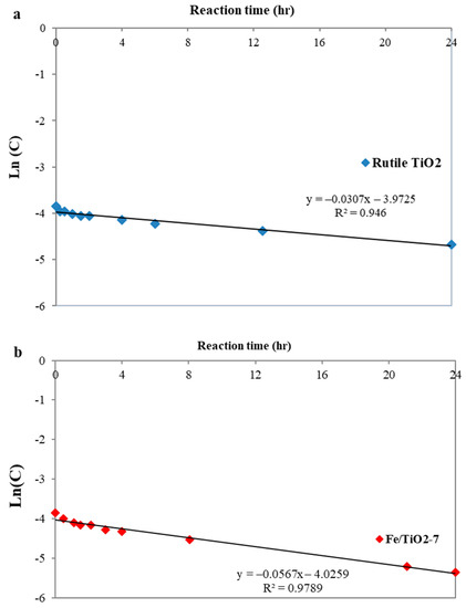 Linear-log plot ln(C0) versus reaction time (h) for the degradation kinetic after 24 h reaction using (a) rutile and (b) Fe/TiO2-7 photocatalysts.