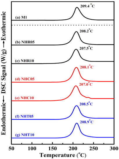 DSC curves of samples (a) M1, (b) NHR05, (c) NHR10, (d) NHC05, (e) NHC10, (f) NHT05, and (g) NHT10 at a heating rate of 10 °C min−1.