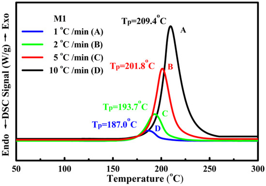 DSC curves of reference sample M1 at different heating rates of 1, 2, 5 and 10 °C min−1.
