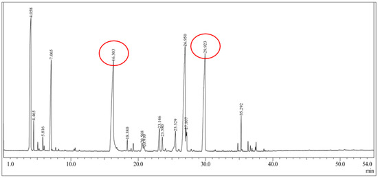 The chromatogram of the citronella oil components identified using GC–MS is shown in Figure 2. The data in Table 1 presents the identified compounds of the citronella oil components. The GC–MS results showed that there were 15 components contained in the citronella essential oil. There were two main compounds of the citronella oil contained in the sample, namely citronella at 19.77% with a retention time of 16.30 min and geraniol at 17.98% with a retention time of 29.92 min. In addition, other compounds had a high % area, including α-pinene at 19.57% with a retention time of 4.06 min and neryl acetate at 20.60% with a retention time of 26.95 min. Other minor components were identified at percentages below 10%, such as camphene, delta 3-carene, 1-methyl-4-(1-methyleneallyl)cyclohexene, linalool, β-elemene, trans-caryophyllene, citronellil acetate, z-citral, α-amorphene, and elemol. The percentage was acceptable, as it was similar to that reported by Rastuti et al. [34] reporting the component of citronella (36.63%) and geraniol (25.71%). Citronella and geraniol compounds tend to be semipolar compounds. During their separation, the interaction of the two compounds with the GC column (nonpolar) was only affected by the boiling point of the compounds. Citronella and geraniol had retention times that tended to be short because the two compounds have the same polarity and interacted weakly with the GC column. Citronella has a lower boiling point than geraniol because the -OH group on geraniol can form strong hydrogen bonds, so its boiling point is higher. Citronella is a type of monoterpenoid aldehyde (-CHO). Therefore, citronella had a faster retention time than geraniol [35].