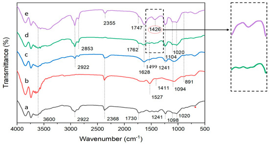 FTIR spectra for: (a) citronella oil; (b) Alg/Carr; (c) Alg/Carr/SDS; (d) Alg/Carr/SDS/citronella oil (non-UTS); and (e) Alg/Carr/SDS/citronella oil (UTS).