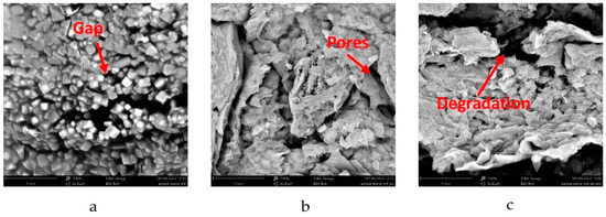 Figure 4c (with ultrasound treatment) shows a different morphology compared to that obtained without ultrasound (Figure 4b). Significant damage to the grain surface was detected for the sonicated samples, which could be observed as dark pores and elongated fissures. Cracks and pores on the surface of the sonicated beads were formed by cavitation phenomena, which locally induced very high stresses and shear forces, leading to the mechanical degradation of the amorphous layer wall material, thereby reducing the particle size, which mainly resulted in multiple channels, fissures, and cracks on the grain surface. This further broke the glycosidic bonds and degraded the carboxyl groups of the alginate, thereby loosening the tight structure of the particles, which in turn provided more space for the surrounding medium to penetrate the particles. Similar results were also shown in a study conducted by Falsafi et al. and Wardhani et al. [40,41].