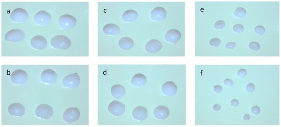 As shown in Figure 3c, with the addition of the SDS into the Alg/Carr, a peak spectrum was formed at 1499 cm−1, which was due to a C-O-S sulfate group belonging to SDS containing a spectrum of beads. As shown in Figure 3d,e, it was determined that the adsorption band widths between 2853 cm−1, 1762 cm−1, and 1747 cm−1 were due to the vibrations of the C=C and C-H bonds stretching the methyl groups of the aromatic compounds in the citronella oil, and this proved that citronella oil smells good and was successfully packaged in the Alg/Carr wall material. As shown in Figure 3d,e, the properties of the functional groups of the citronella oil were found to have been little effected by the ultrasound treatment. As shown in the spectrum from Figure 3e, the Alg/Carr/SDS/citronella oil treated with UTS showed a sharp band at 1426 cm−1, which showed the C-H bond. The ultrasonication process caused the C-H bond to break, resulting in polymer degradation. Furthermore, the citronella oil was encapsulated in the Alg/Carr wall materials in the presence of the ultrasonication. Therefore, the ultrasonication had no significant effect on the FTIR spectrum encapsulation of the citronella oil in this process. This was in accordance with the research conducted by Liang et al. [39], where stronger hydrogen bonds and electrostatic interactions caused changes in the secondary structure of zein in resveratrol encapsulation.
