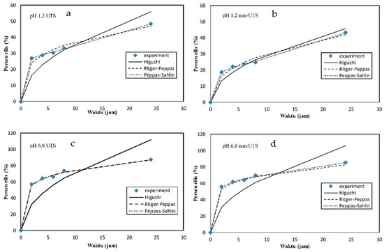 Release kinetic plots: (a) pH 1.2 non-UTS; (b) pH 1.2 UTS; (c) pH 6.8 non-UTS; (d) pH 6.8 UTS.