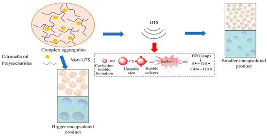 Based on the explanation in the previous section, an ultrasound-assisted encapsulation mechanism was developed. Figure 7 shows the proposed mechanism in this study. As reported in several previous studies, the working principle of the ultrasonication process is that it causes an acoustic cavitation effect [26,47].
