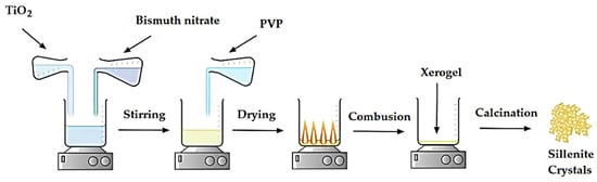 The sillenite Bi12TiO20 was created using the sol-gel process by combining stoichiometric proportions (1:12 ratio) of [Bi(NO3)3∙5H2O] and [TiO2] in an aqueous solution with a concentration of 20% volume HNO3 for improved solubilization. Following solubilization, a 15% w/w dose of PVP K30 solution was added to the initial solution as a combustion component. After being concentrated for 24 h by evaporation at 80 °C, the resultant solution was transformed into a yellow gel. This gel was then burned at 200 °C for 6 h to turn it into xerogel. To increase crystallinity and eliminate any leftover carbonated waste from burning, this amorphous xerogel was crushed and then calcinated at 600 °C in the air for 6 h. The calcination duration of 6 h was chosen since it was discovered that calcining the sample for more than 6 h might melt it and cause it to stick in the oven due to the maximum calcination temperature. In addition, the crystallinity was improved and the carbonaceous residue was eliminated from the combustion process by selecting the longest calcination duration [45]. Figure 1 provides a schematic illustration of the sol-gel synthesis procedure.