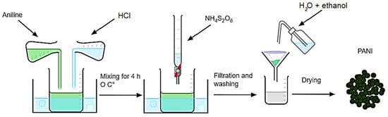 Polyaniline (PANI) was synthesized chemically according to the method described in the literature [46]. A total of 0.2 mol of Aniline was dissolved in 200 mL of hydrochloric acid HCl solution (0.5 M). The two solutions were mixed at 0 °C with stirring for 30 min. Then, 200 mL of ammonium persulfate (NH4)2S2O8 (0.5 M) as an initiator was added dropwise to induce the polymerization reaction, and the reaction was carried out with magnetic stirring. After 4 h, the residue was obtained by filtration using filter paper and washed thoroughly with ethanol and deionized water to remove excess acid and Aniline oligomer, then dried at room temperature for 48 h. Figure 2 represents the diagram of the synthesis.