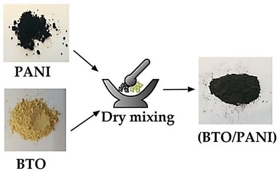 After obtaining the pure phase of both the catalyst Bi12TiO20 and the adsorbent Polyaniline, they were mixed by grinding using a pestle in an agate mortar in order to obtain a hybrid system (catalyst/adsorbent). The mixture was constantly mixed until a homogenous powder was formed. Preliminary tests have been performed in order to find the optimal ratio between the catalyst and the adsorbent, by changing the ratio between BTO/PANI: 100% PANI, 75%/25%, 50%/50%, 25%/75% and 100% BTO. The tests were all in the same conditions of a pH of 6, 200 mL of 30 mg/L CFX concentration, 2 g/L of total added materials mass (PANI + BTO), and under UV irradiation. The optimal ratio was found to be 75%/25%. A schematic of the BTO/PANI hybrid system’s preparation is shown in Figure 3.
