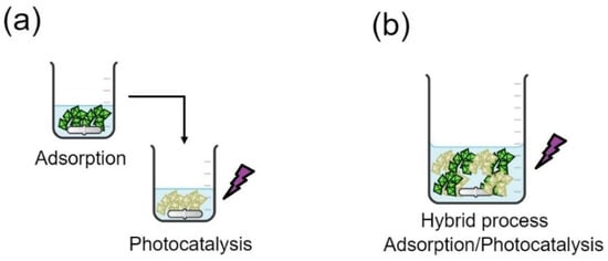 The kinetics of the adsorption (Figure 8b) was studied using the following pseudo-first-order model of the photocatalysis process (Equation (5)) in order to compare its kinetic constant with the combined and hybrid systems.