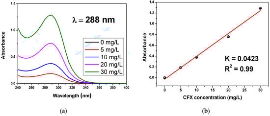 A calibration curve was constructed by spectrophotometry to show the absorbance of a solution as a function of the CFX concentration. The concentrations of CFX employed in the trials given in this study vary from 5 mg/L to 30 mg/L. The dilution was made to prepare a series of four concentrations defeated (5 mg/L, 10 mg/L, 20 mg/L, 30 mg/L); then, the absorbance of each solution was measured. The 0 mg/L (blank) was measured by a tank containing distilled water. Figure 5 shows the calibration curve as well as the associated UV spectrum of different concentrations. The calibration curve is linear over the chosen concentration interval, so the Beer–Lambert law is verified to determine the molar extinction coefficient. The Beer–Lambert is generally presented as the next relation.