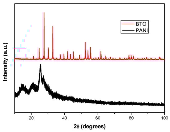 The materials were characterized by XRD analysis to confirm the obtaining of the phases. XRD analysis was performed by PW 1730 Philips with monochromatic radiation with λ = 0.15417 nm. Other characterization techniques are provided in previous studies for BTO [15,47] and for PANI [46,48,49].