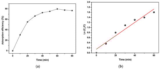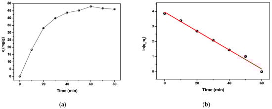 where qe (mg/g) and qt mean the adsorption capacity of the adsorbent at equilibrium and at time t (min), respectively, and K (6.29 × 10−2 min −1) is the pseudo-first-order rate constant (min−1), which was determined by the slope and the order at the origin, respectively, from the plot of ln (qe–qt) as a function of time shown in Figure 7b.