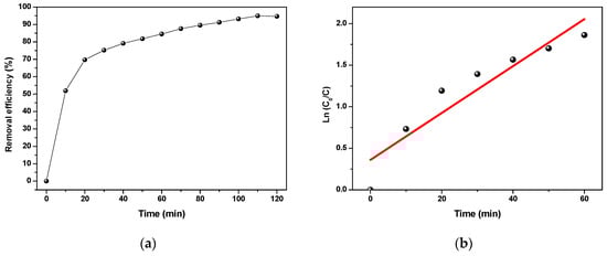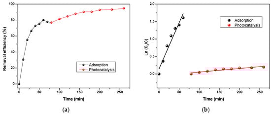 (a) CFX removal by adsorption combined with photocatalysis and (b) the pseudo-first-order kinetic plot.