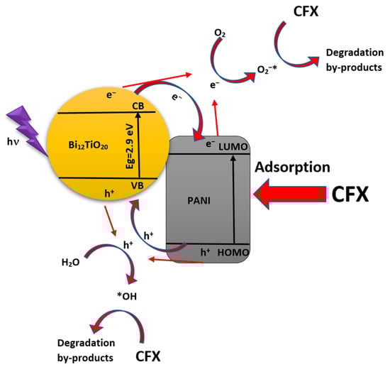 The next reactions could describe the mechanism of CFX photodegradation over the BTO/PANI hybrid system. Figure 11 shows a schematic depiction of the proposed mechanism.