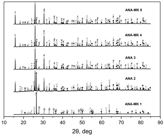 The analcime used as raw material was characterized in our earlier studies. Previous results showed that all the main spikes in the XRD diffractogram are associated with analcime (Na8Al8Si16O48(H2O)8). In addition, analcime may contain silicon oxide (quartz, SiO2) and lithium aluminum silicate (spodumene, LiAlSi2O6) [49,60]. The obtained XRD patterns in the present study are shown in Figure 3. According to the software there are many candidates, and many peaks are overlapping. All of the alkali-activated sorbents contained silicon oxide (SiO2, ICDD 04-014-7568), iron oxide (Fe2O3, ICDD 04-010-3230), sodium aluminum silicate (hydrate) (NaAlSi3O8, ICDD 01-083-1609 or NaAl(Si2O6)(H2O), ICDD 01-074-2219), and lithium aluminum silicate (LiAlSi2O6, ICDD 04-020-3038). They may also contain magnesium silicate (Mg(SiO3), ICDD 01-076-6770), calcium aluminum silicate (CaAl2Si2O8, ICDD 00-041-1486), calcium magnesium iron oxide (CaMg2Fe16O27, ICDD 00-056-0629), and potassium sodium calcium aluminum silicate (K0.05Na0.94Ca0.01Al1.01Si2.99O8, ICDD 04-023-4722). The results showed that ANA-MK 1 considerably differed from the other alkali-activated analcime sorbents. Peak intensities were lower in ANA-MK 1; moreover, a high-intensity peak at position 27, which is associated with sodium aluminum silicate hydrate (NaAl(Si2O6)(H2O), ICDD 01-074-2219), was not observed in ANA-MK 1 compared with the other preparations. In the case of ANA-MK 1, SiO2 was crystallized very well, and the intensity peak at 2θ of 26.6° was very high.