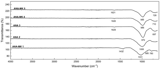 The FTIR spectra of the alkali-activated analcime sorbents are shown in Figure 4. The peaks between ~1621 and 1628 cm−1 can be attributed to the hydroxyl group with the stretching and bending vibrations of the adsorbed water [46,61]. The band between ~979 and 1031 cm−1 can be assigned to the internal stretching vibrations of Si–O(Si) and Si–O (Al) [46,62]. The bands between 697 and 880 cm−1 belong to the T–O (T=Al, Si) symmetric stretching vibrations [60,63,64,65,66]. These vibrations are typical for zeolite materials. The FTIR spectra of alkali-activated analcime sorbents exhibit similar vibrations to raw analcime and Ba-modified analcime [60].