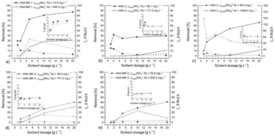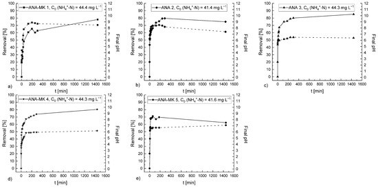 Effect of contact time on NH4+ ion removal onto (a) ANA-MK 1, (b) ANA 2, (c) ANA 3, (d) ANA-MK 4, and (e) ANA-MK 5. The removal percentage of NH4+ ions is represented by a solid line, and the final pH values are represented by a dashed line. Experimental conditions: sorbent dosage: 5 g L−1; the volume of the solution: 0.975 L; C0 (NH4+-N): ~40 mg L−1; initial pH of the solution: 2.5; contact time: 24 h; and temperature: 22 °C–23 °C.