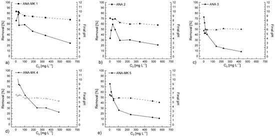 Effect of initial concentration on NH4+ ion removal onto (a) ANA-MK 1, (b) ANA 2, (c) ANA 3, (d) ANA-MK 4, and (e) ANA-MK 5. The removal percentage for NH4+ ions is represented by a solid line, and the final pH values are represented by a dashed line. Experimental conditions: sorbent dosage: 5 g L−1; initial pH of the solution: 2.5; contact time: 24 h; and temperature: 22 °C–23 °C. Analysis was based on the concentrations of NH4+-N.