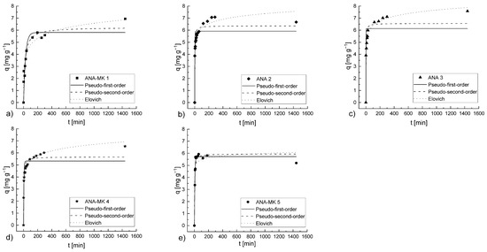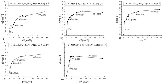 Kinetic studies were performed for all the prepared sorbents at room temperature using the model solution with an NH4+ ion concentration of 50 mg L−1 (c(NH4+-N), 40 mg L−1). As can be seen in Figure 9, the removal percentage increased quite rapidly, reaching the maximum removal percentage and equilibrium. The availability of a larger number of sorption sites can explain this observation. The maximum NH4+ ion removal percentage of the sorbents was ~80%, except for ANA-MK 5, which had a ~70% removal.