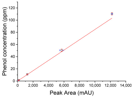 The equation obtained by linear regression gives phenol concentration (C) as a function of the area of the chromatographic peak (Equation (3)):