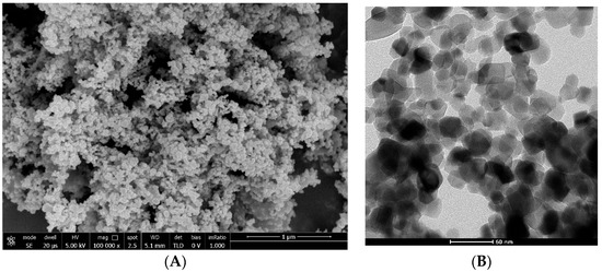 The commercial sample of Aeroxide P-25 was characterized to verify the main morphological properties. SEM and TEM analyses confirmed that the sample consisted of sphere-like grains with average dimensions of 25 nm (Figure 2A,B).