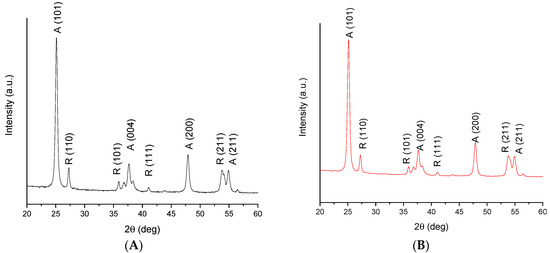 XRD pattern of the commercial Aeroxide P-25 photo-catalyst: (A) fresh catalyst; (B) after 5 catalytic cycles, each of 5 h.