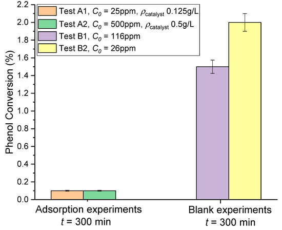 Phenol adsorption (without UV irradiation) and blank (without catalyst but with UV irradiation) experiments, all conducted at T = 40 °C and pH = 7.