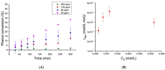 It is interesting to plot the observed reaction rate (robs) trend vs. the initial phenol concentration (C0), Figure 5B. The observed reaction, robs, rate was calculated in agreement with Equation (5).