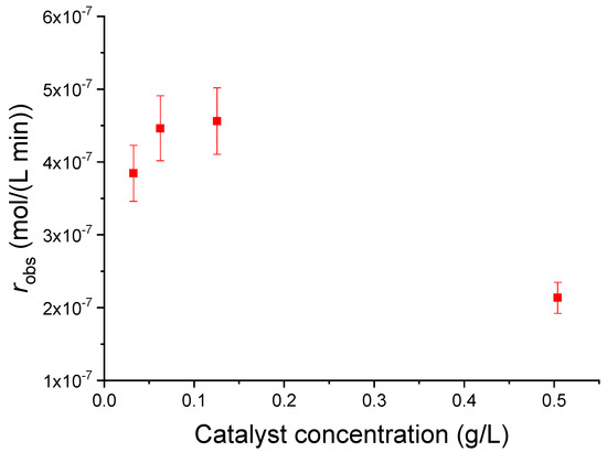 Figure 7 shows that when increasing the catalyst concentration, the initial rate of reaction at first increases; then, from 0.125 to 0.5 g L−1, it starts to decrease. This behavior could be attributed to the double effect of the catalyst concentration on the reaction rate: on the one hand, increasing the catalyst concentration increases the number of active sites, thus accelerating the reaction; on the other hand, it decreases the light penetration in the suspension, due to the screening effect and unfavorable light scattering. Consequently, the catalyst concentration of 0.125 g L−1, which yielded the highest reaction rate, was chosen along the initial phenol concentration of 25 ppm to perform a set of kinetic tests.