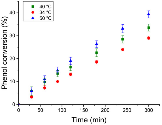 A set of kinetic tests was carried out to explore the effect of the temperature on the reaction rate and to create an Arrhenius plot for the process. The three runs for this set were performed using an initial phenol concentration of 25 ppm and catalyst loading of 0.125 g L−1, at three different temperatures: T = 30 °C, 40 °C, and 50 °C (Figure 8, tests 4, 8, and 9 in Table 2).