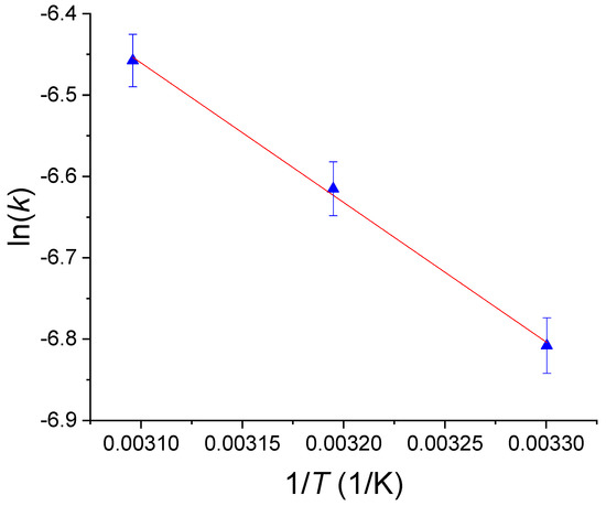 By plotting ln(k) vs. 1/T, the Arrhenius plot for the process was elaborated, as depicted in Figure 9.